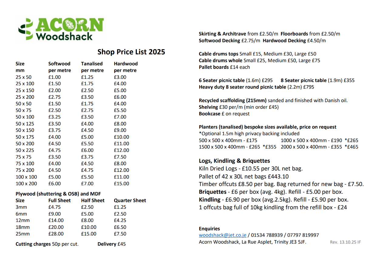 For all enquiries, orders of logs or timber sales please email us at woodshack@jet.co.je or call 01534 788939 or 07797 819997. A member of the team will get back to you within 1 working day.